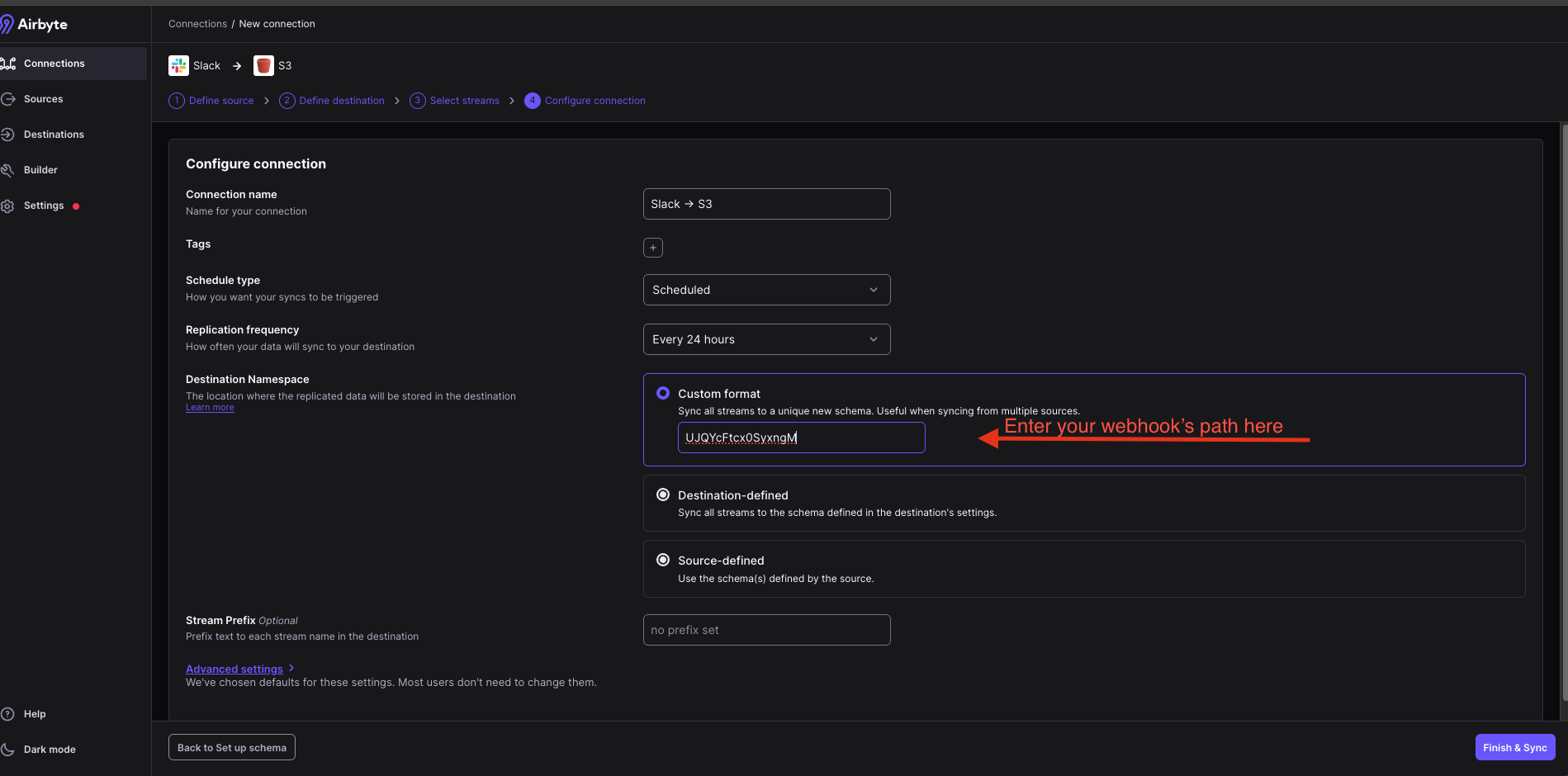 In the Configuration step, under "Destination Namespace", choose "Custom Format" and enter the webhook URL you copied when setting up the webhook, for example: "wSLvwtI1LFwQzXXX".