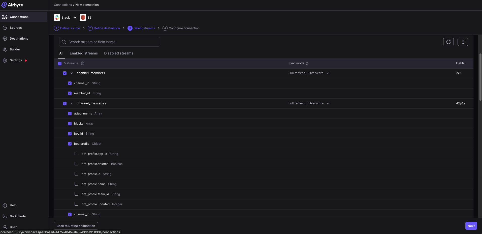 Set up the Connection between the source and destination - in this step you will be able to define what data will be ingested, to which webhook integration in Port (see below "Set up the Connection"), how often will the sync will be executed, and in what mode (full refresh / incremental).