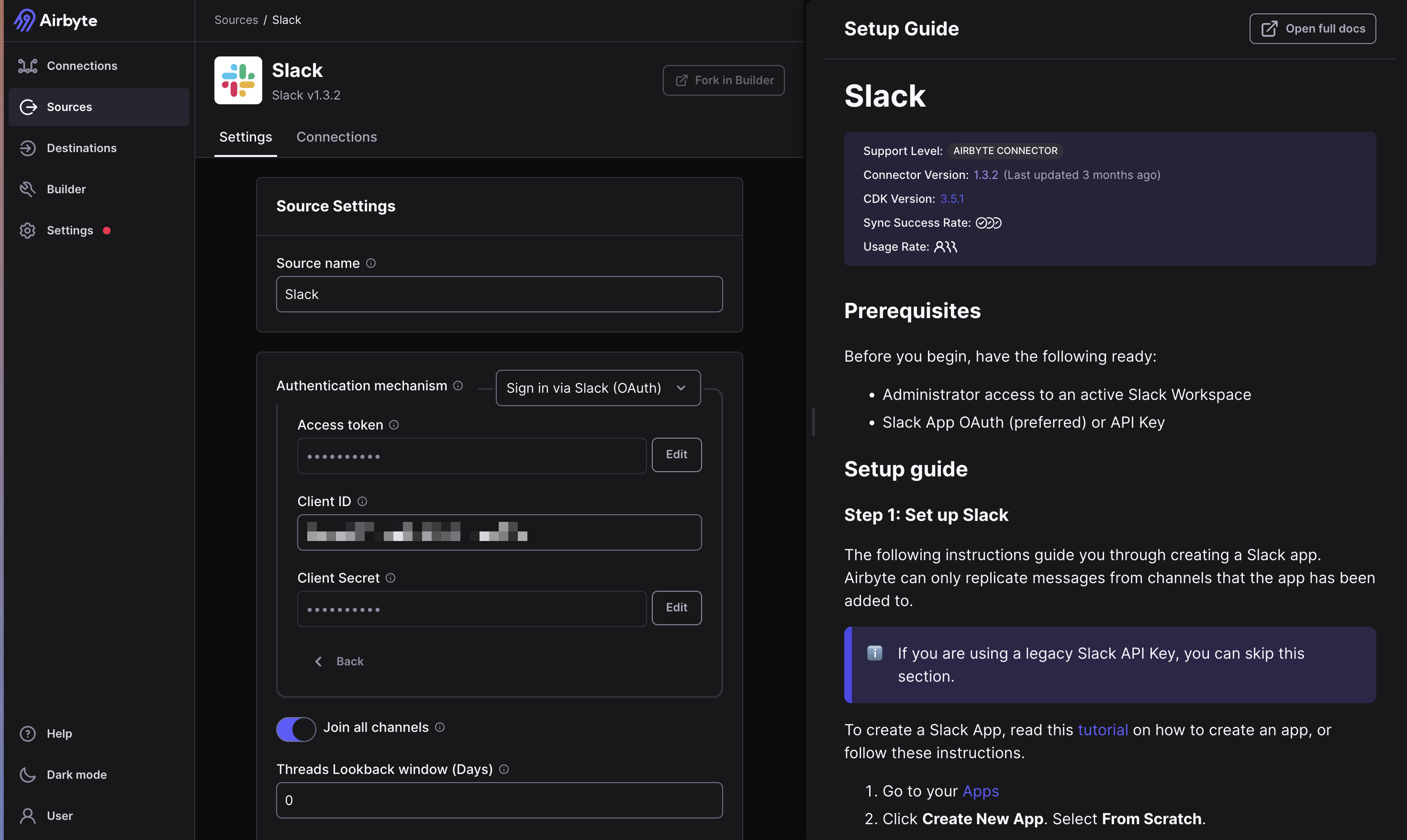 Set up the Data Source - once per data source you wish to integrate. Airbyte provides detailed documentation on how to generate/receive the appropriate credentials to set each data source.