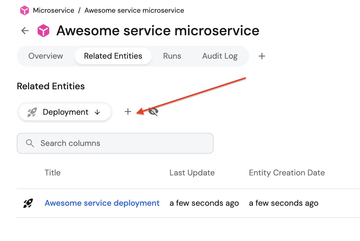 When you're on the entity page of a Deployment Workflow, the related entity Microservice automatically appears, but Deployment does not, since its relation is in the other direction. However, you can create a custom tab to show Deployment entities by leveraging the indirect relationship through Microservice.