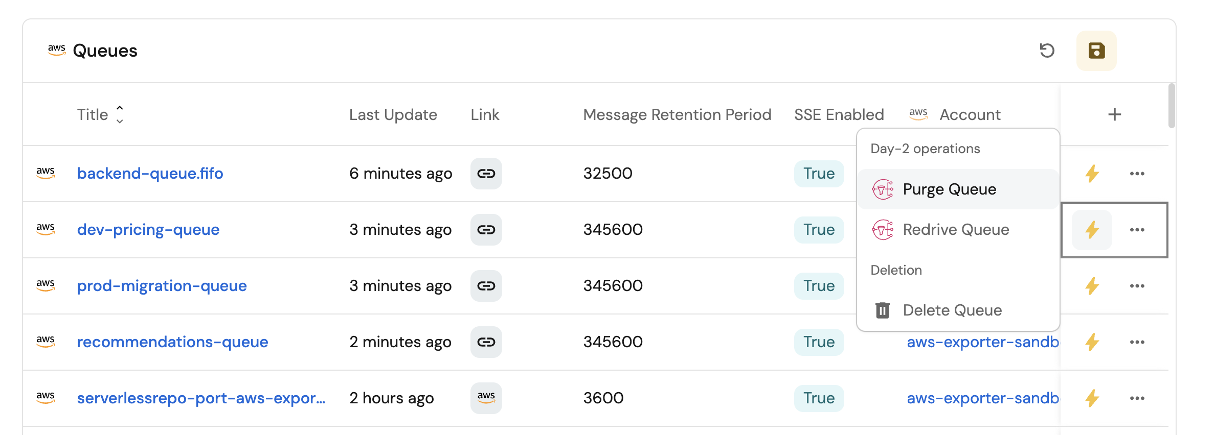 - Set up self-service actions to manage SQS queues (purge, redrive, and delete).